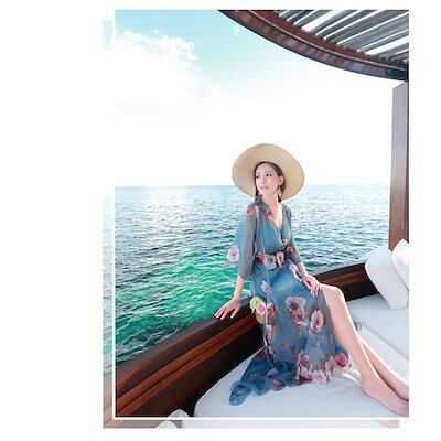 マキシワンピース リゾート レディース ハワイワンピース ロング 五分袖 リゾートワンピシフォン