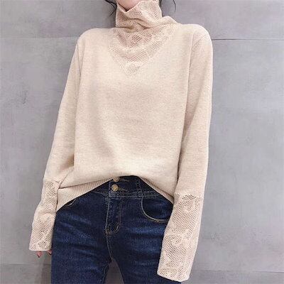ニットセーター レディース ニットソー レース 無地 長袖 ハイネック 切り替え ニットウェア ゆったり おしゃれ トップス レースセーター オシャレ オフィス 着痩せ 大人 可愛い 大人 お出かけ | gizshop