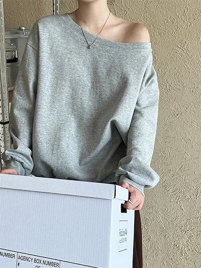トップス パーカー レディース 肩出し ブルオーバー 2way 春 秋冬 長袖 無地 レイヤード 重ね着 クルーネック 綿混 コットン トレーナー インナー ゆったり シンプル カジュアル オシャレ | gizshop