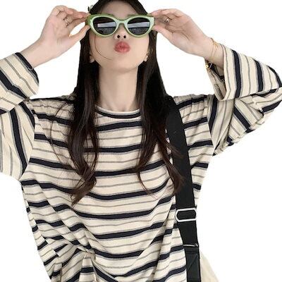 ラウンドネックストライプ長袖Tシャツ女性2024秋新作緩い薄いカジュアル学生オープントップス