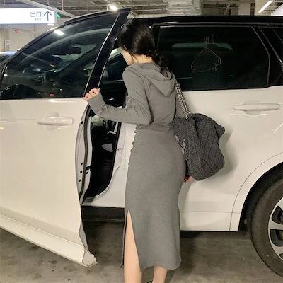 スリムフード付き長袖ワンピースレディーススキニースプリットパッケージヒップインサイドボトムロングスカート