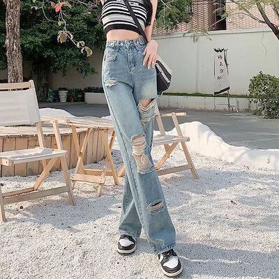 脚長効果!デニムパンツリップドジーンズストレート調節可能ハイウエストカジュアルルーズデニムワイドレッグパンツ