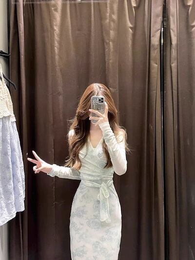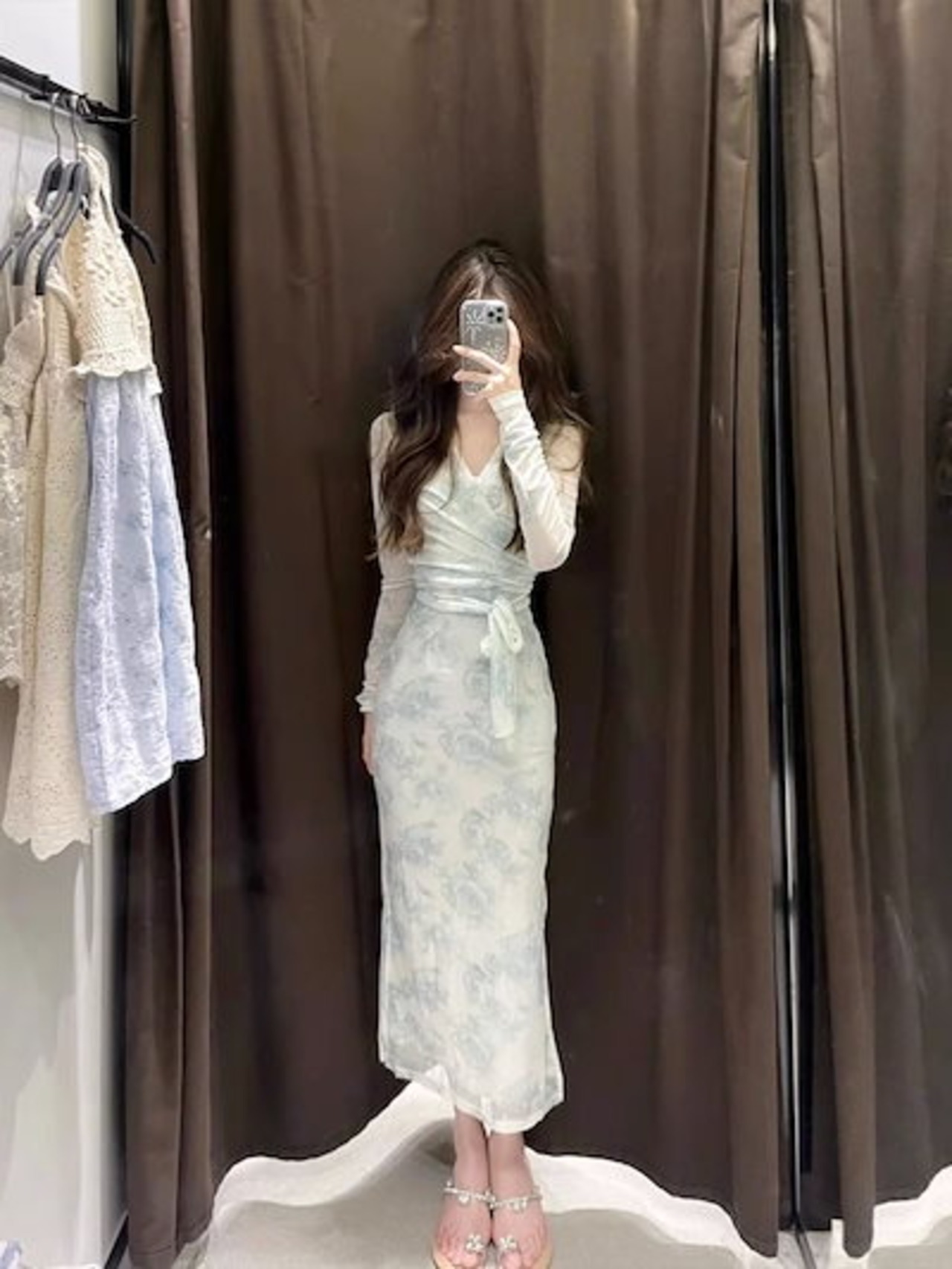 セットアップVネック花柄メッシュ長袖ワンピースレディースカーディガンスリムウエスト2点セット
