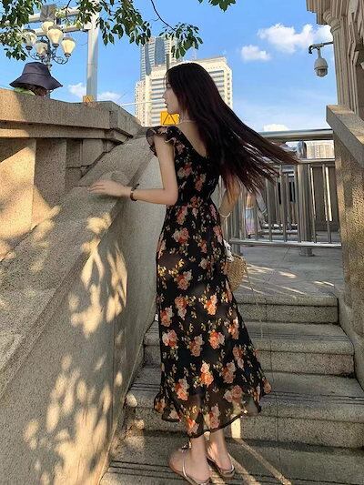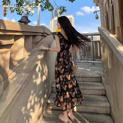 花柄ホルタードレス女性夏2024新しいフライフライスリーブウエスト細いAラインロングスカート