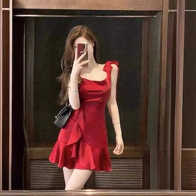 ヘビロテ!キャミワンピース赤いホルタードレス女性の夏の新しいウエスト細いショートドレス