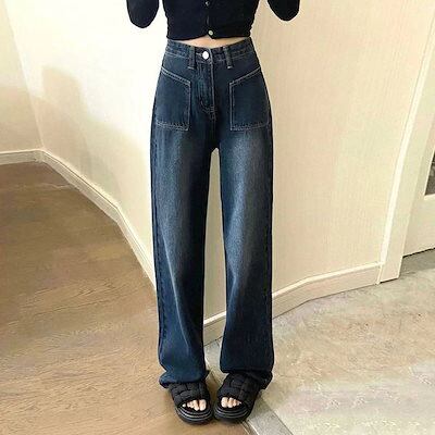 2024 初秋 デニムパンツ ブルーとグレーのアメリカンワイドレッグジーンズ 女性用大ポケットストレートハイウエスト小梨型体型ドラッグパンツ 韓国ファッション