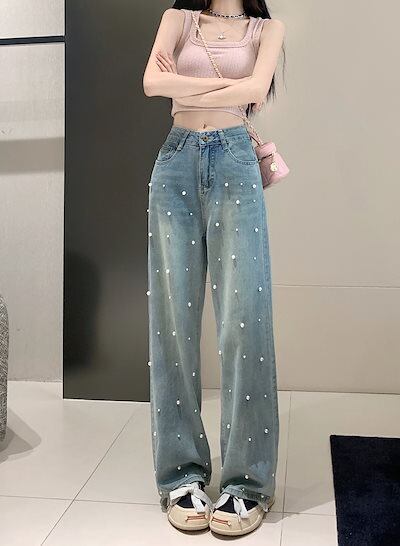 2024 初秋 デニムパンツ パンツ デニム ジーンズ スキニー レッグ ハイウエスト 脚長効果 美脚効果 細見え 水色 ライトブルー ストリート系 カジュアル ズボンファッション デザインお出 韓国 | gizshop