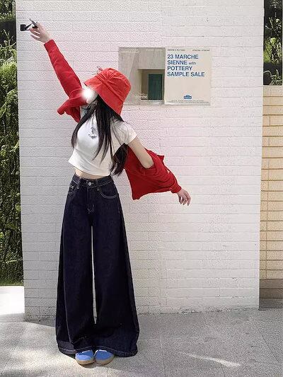 2024 初秋 デニムパンツ パンツ ロング丈 デニム ジーンズ ワイド ストレート ハイウエスト 美脚効果 脚長効果 細見え レトロ インディゴブルー レディース かわいい お 韓国ファッション