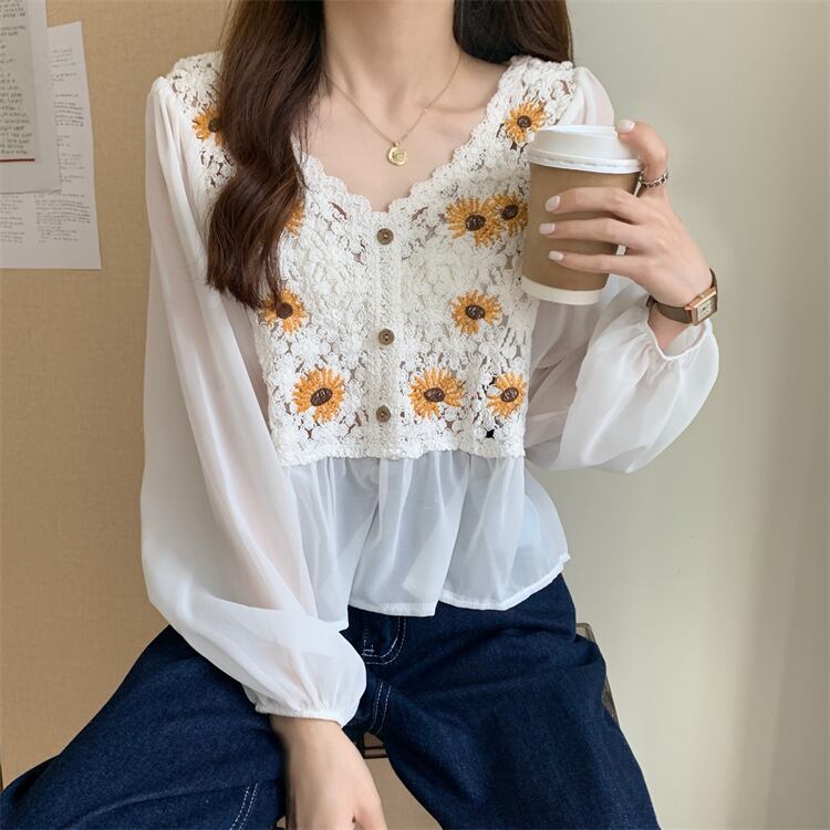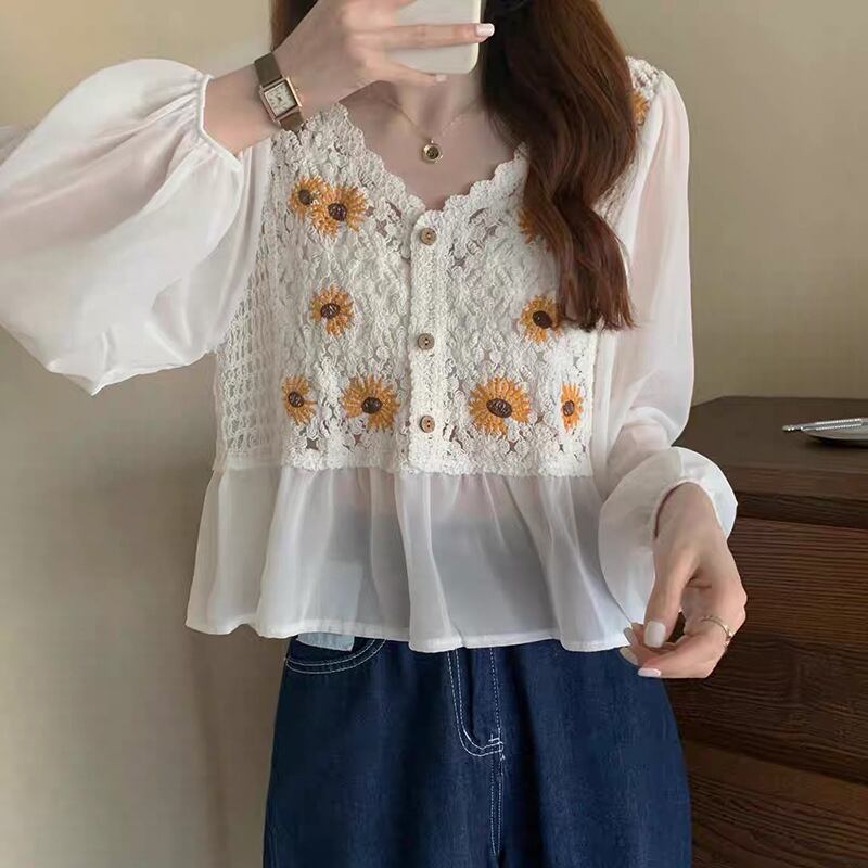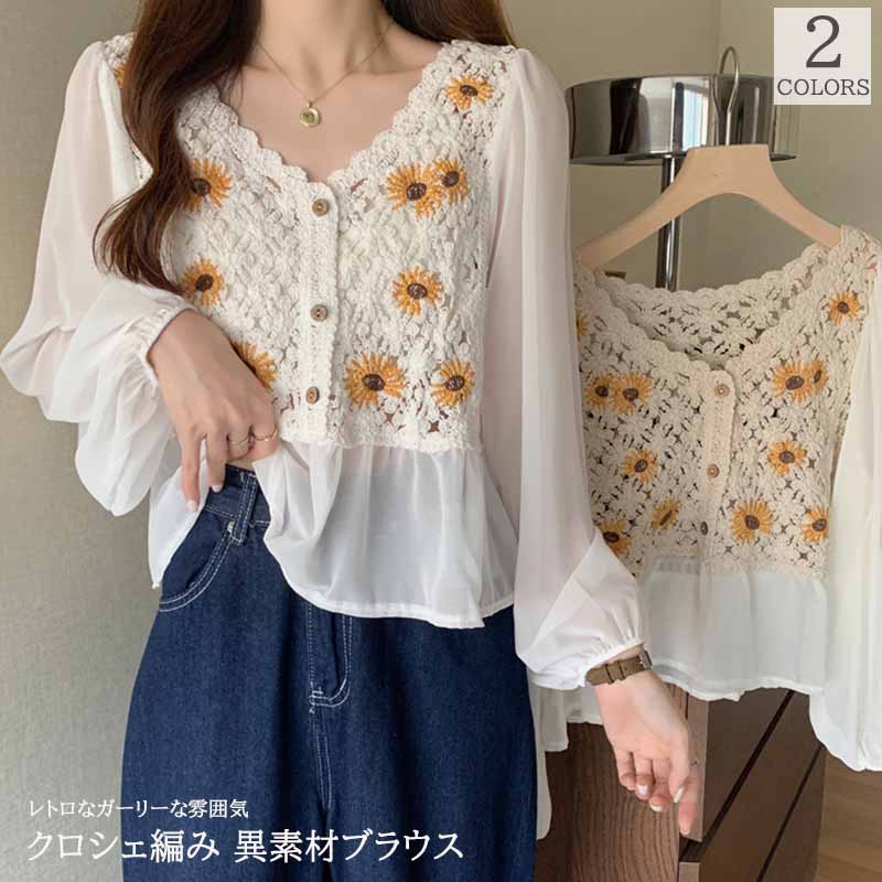 2023新作 レディース トレンド トップス サマーニット クロシェ 透かし編み シフォン ホワイト 半袖