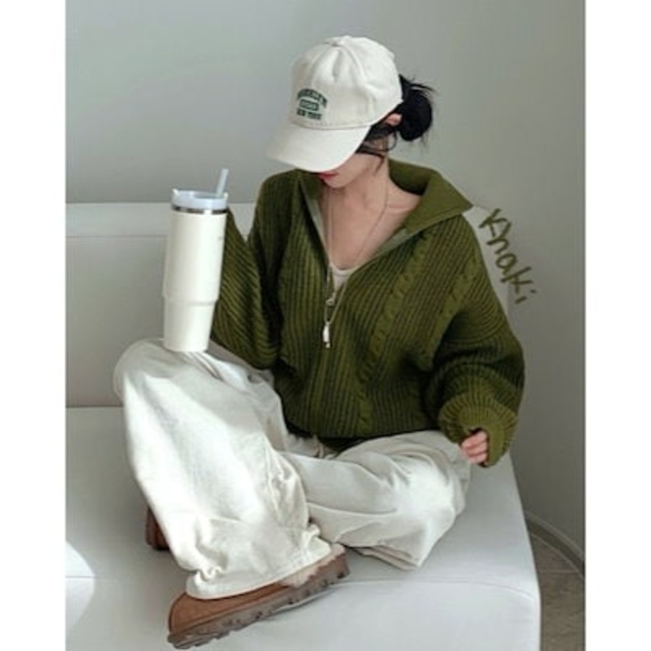 [トーンダウンピンタームード] メイプル ルーズフィット ケーブル編み ニット ツーウェイ ジップジップアップ