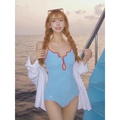 水着 2024 女性用胸パッド付きブルーチェック柄新作水着