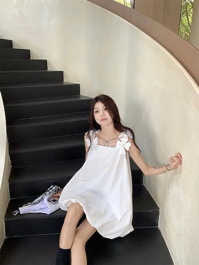 2024春夏ワンピース ノースリーブ スクエアネック ミニ丈 Aライン 花 ゆったり 細見え 夏 白 ホワイト おしゃれ かわいい 甘め キュート ラブリー 韓国ファッション レディース お出かけ