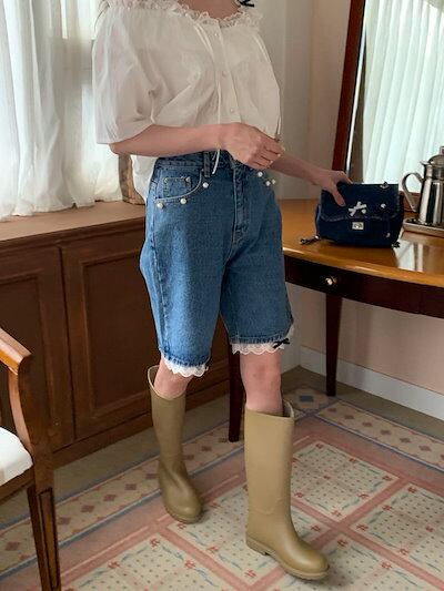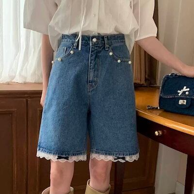 2024 春夏パンツ ハーフパンツ デニム ジーンズ ワイド レース リボン ハイウエスト 美脚効果 脚長効果 細見え 夏 おしゃれ かわいい 韓国ファッション レディース お出かけ