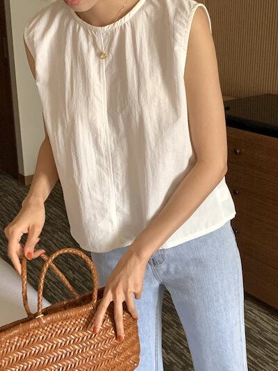 2024 春夏トップス シャツ ラウンドネック ノースリーブ バックオープン ゆったり 細見え 夏 青 黒 白 きれいめ おしゃれ かわいい キュート 韓国ファッション レディース お出かけ | gizshop