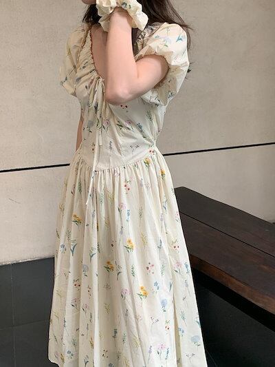 2024春夏ワンピース ロング丈 Vネック 半袖 バブル袖 花柄 Aライン リボン ゆったり 細見え 夏 カジュアル おしゃれ かわいい キュート 韓国ファッション レディース お出かけ