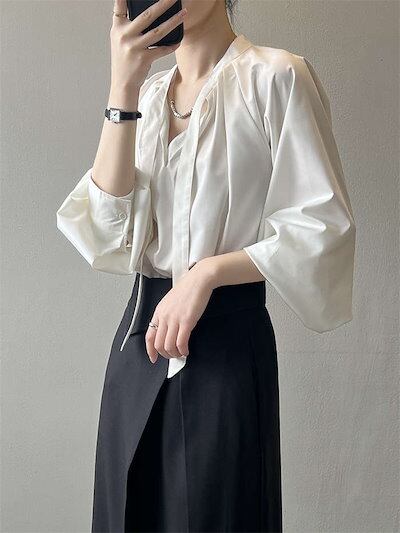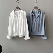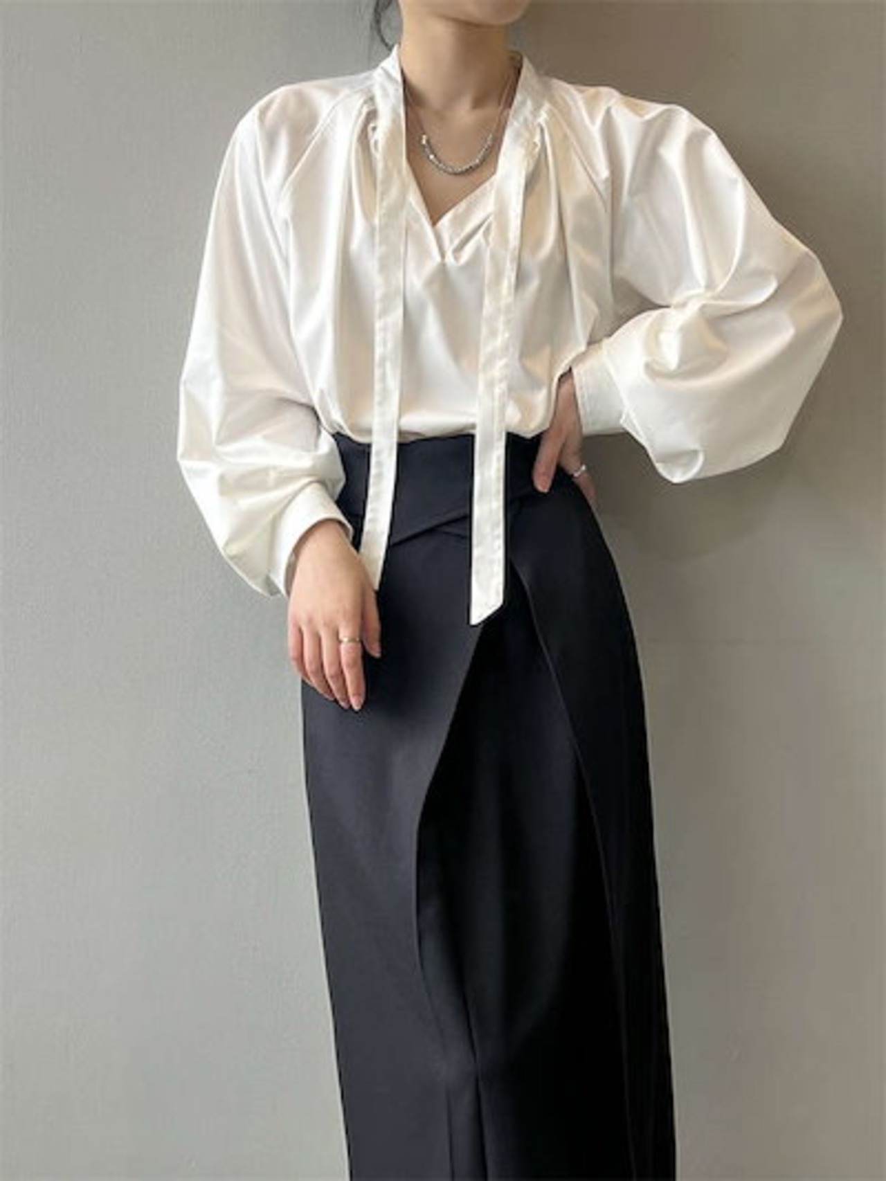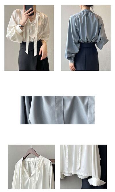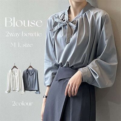 ブラウス ボウタイ 長袖 レディース トップス シャツ 白シャツ 春夏 きれいめ リボンタイ リボン スーツインナー ショート丈 シャツブラウス 長袖ブラウス ボリューム袖 シンプル とろみ 大人 お | gizshop