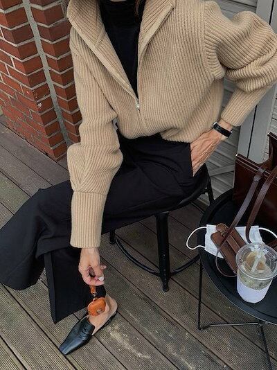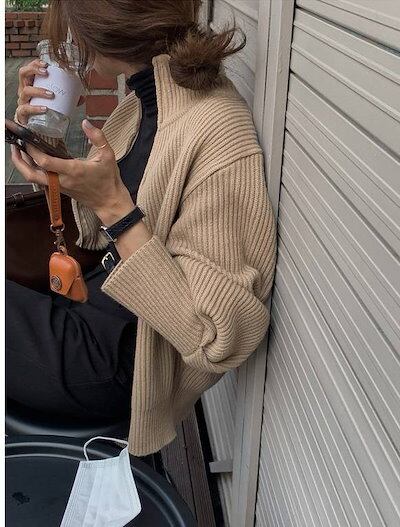 2色 トップス レディース ニット ジャケット スタンドカラー ック 無色 リブ 長袖 萌袖 シンプル 大人カジュアル アウター クール こなれ感 ラフ 抜け感 かっこいい ファッション 通学 | gizshop