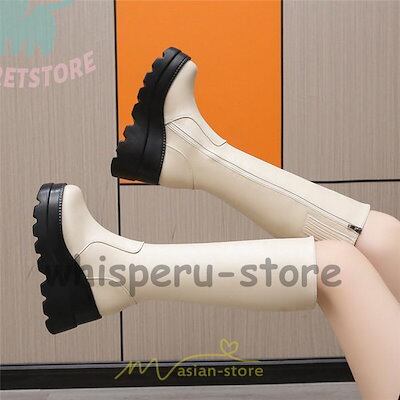 ロングブーツ レディース ブーツ 厚底 歩きやすい 痛くない 定番 カジュアル ブーツ ファスナー 黒 ブラック オフホワイト 白 美脚 おしゃれ シンプル