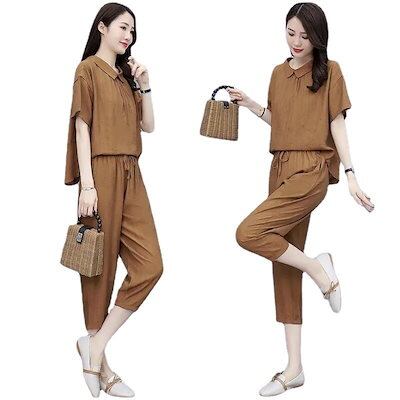涼しく楽ちんセットアップ レディース 夏 韓国 2024新型サマーサイズカジュアルファッションリネン2点セット 半袖 ルームウェア セットアップ スウェット上下セット スーツ