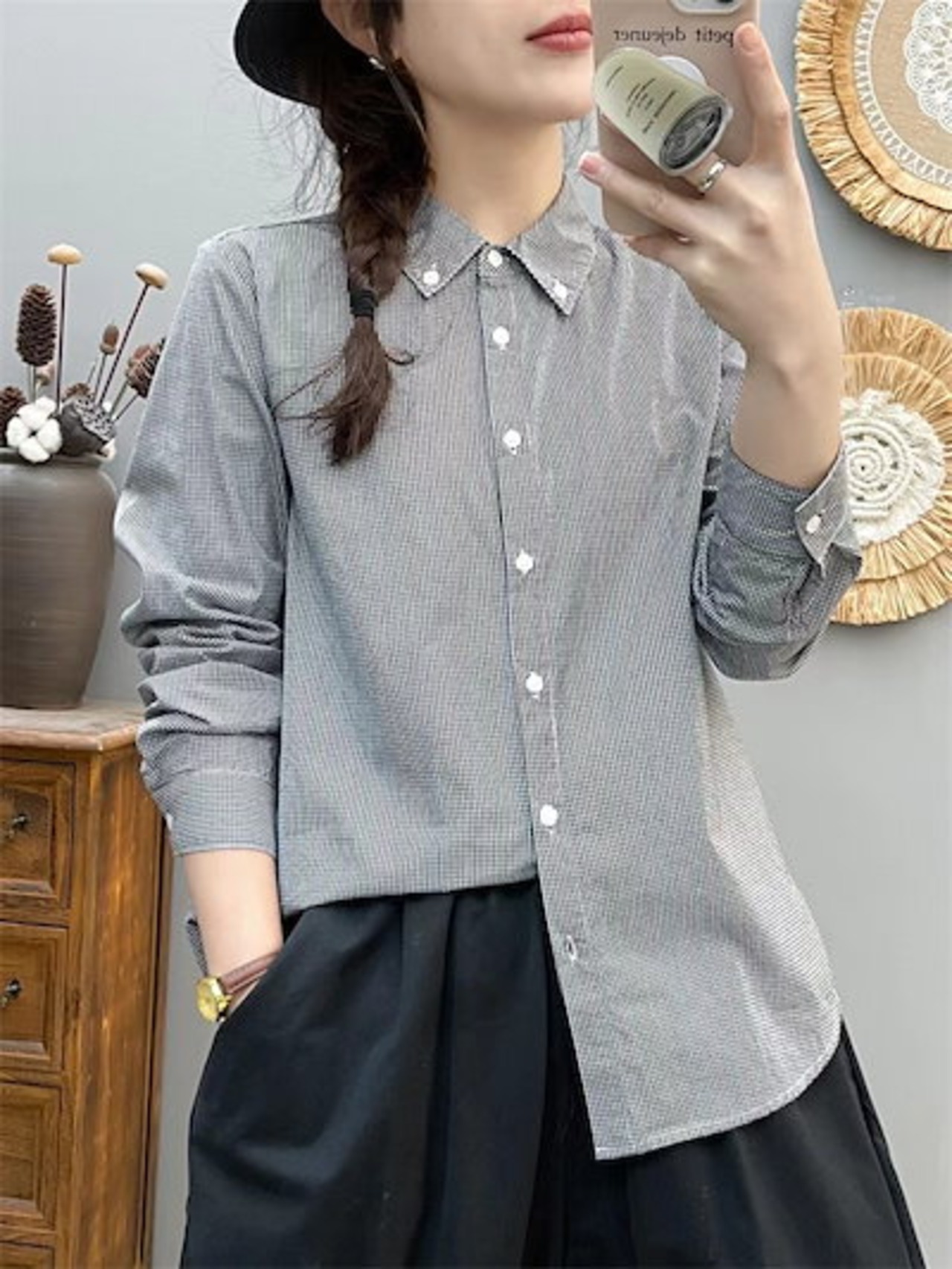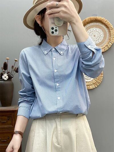 コットン シャツ ギンガムチェック レディース 長袖シャツ 綿100% 通勤シャツ スーツインナー フォーマル OL オフィス ビジネス チェック柄 シンプル ベーシック 綿 ゆったり 柔らかな肌触り