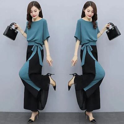 レディース2点セットセットアップシフォンパンツスーツ上下セット春夏カジュアル半袖パンツトップスハイウエストワイドパンツロングきれいめフォーマル大きいサイズ上品3040通勤OLウエストリボン | gizshop