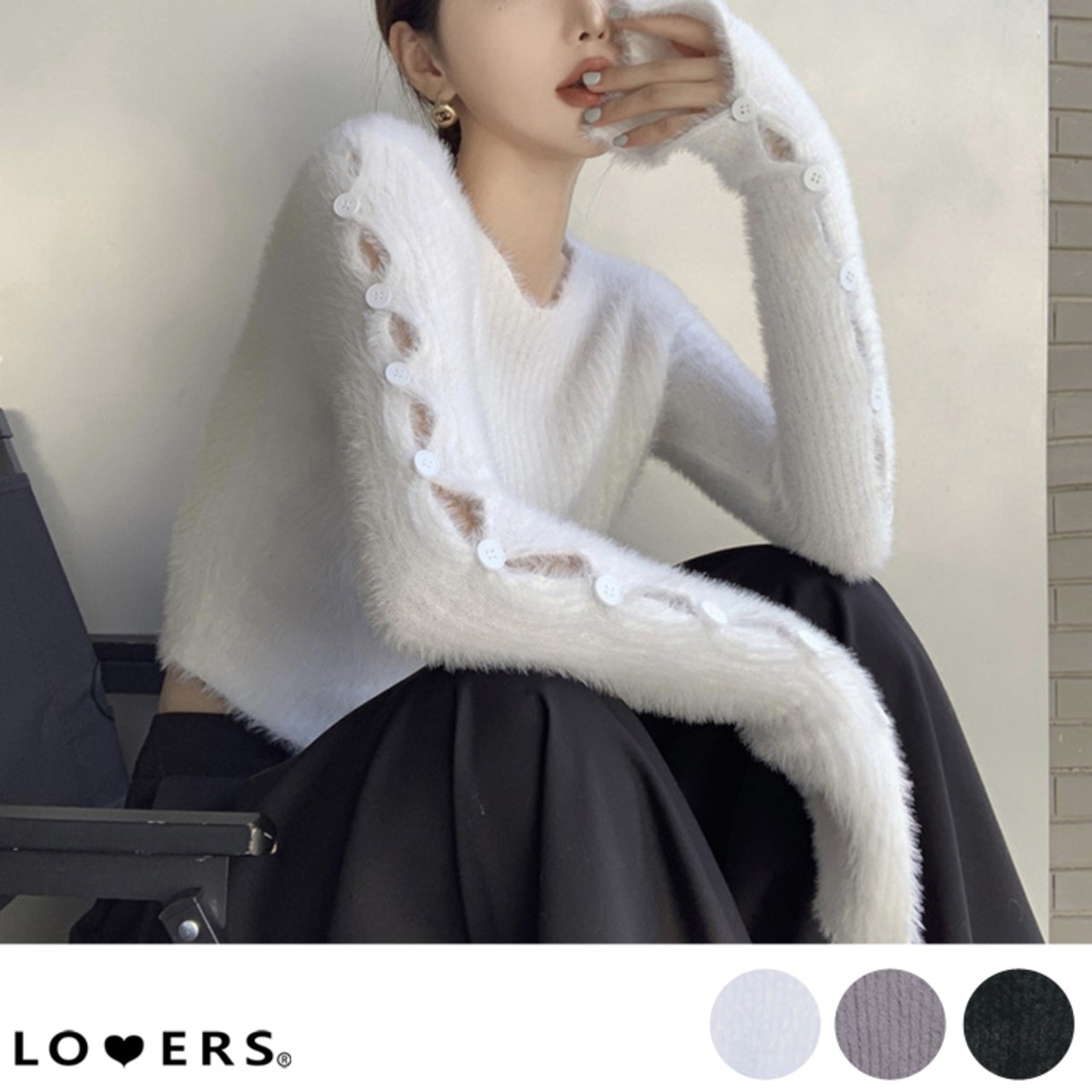 クロップド丈 袖ボタン シャギーニット 【即納】 セーター レディース 韓国 プチプラ おしゃれ