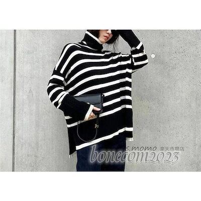 レディース ハイネック ゆったりプルオーバー オシャレ韓国風 秋冬代長袖セーター ショット丈セーター ニットトップス 大人ニットインナー ボーダー柄