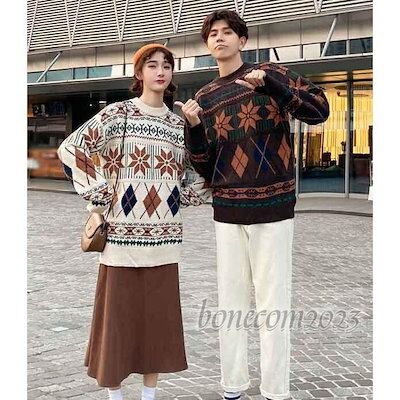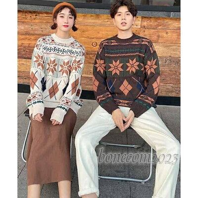 ニット ひし形 上品 レディース クリスマス カップル 幾何柄 メンズ ペアルック クルーネック 男女兼用 秋冬 ベージュ 長袖 レジャーセーター セーター コーヒー
