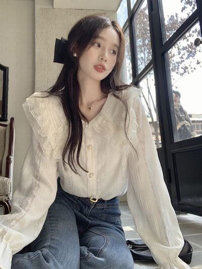 2024 秋先取 ブラウス 今っぽシアーシャツ シアーシャツ 長袖 版 フレンチレース パッチワークドールネック 甘い 長袖 シャツ オフィス トップス レディース 韓国ファッション | gizshop