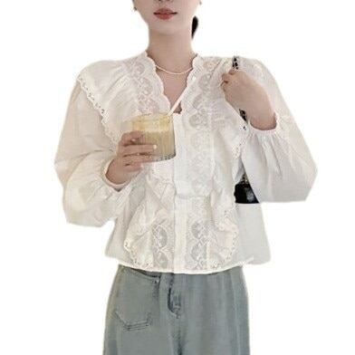 ブラウスレディス 春秋新作 フレンチ フリル ホワイトシャツ ショートレースシャツ シャツ着 長袖 上着 韓国ファッション