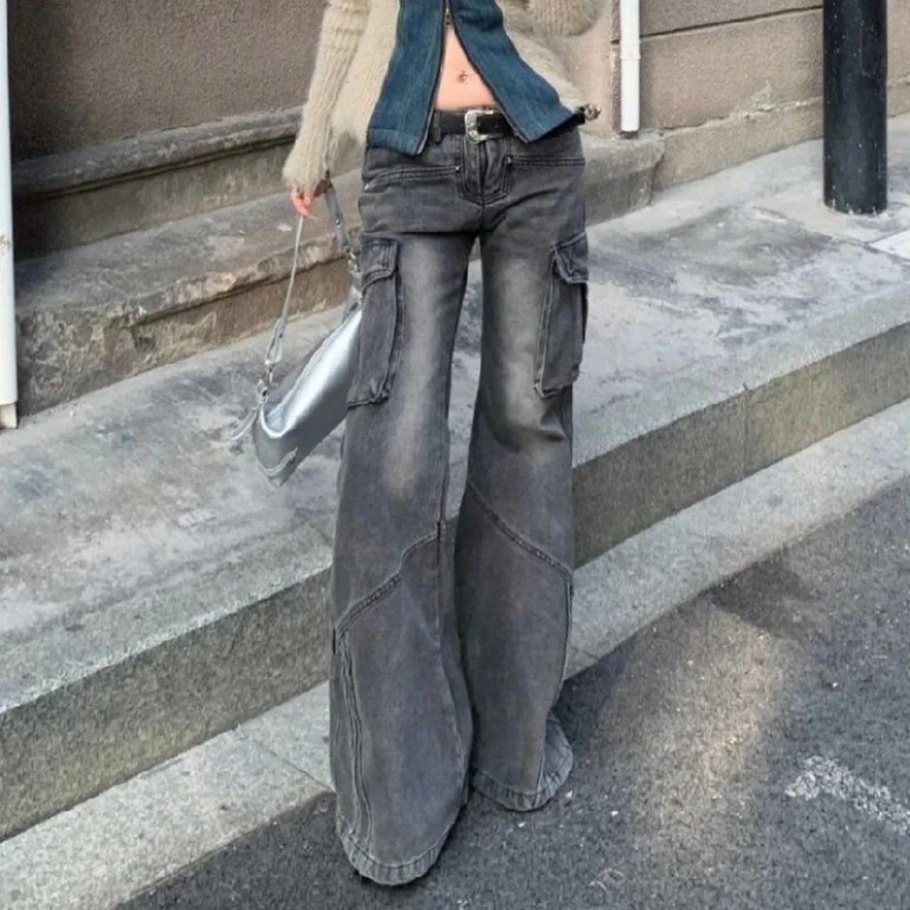 女性の個性的なポケットデザインバギーカーゴパンツ、アメリカのローウエストのワークウェア、ヴィンテージウェア、ゆったりとしたアーティスト、ストレートレッグ、flared y2k ボトムス T240901121327_03 | gizshop