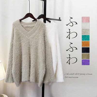 セーター ニット レディース 秋冬 ニットセーター シャギーニット シャギーセーター 秋 冬 トップス プルオーバー ニットトップス vネック 起毛ニット ミディ丈 モヘア ドロップショルダー ふわふ | gizshop