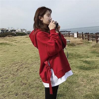 パーカー スウェット レイヤード レディース プルオーバー リボン レースアップ フード付き 重ね着 体型カバー ゆったり 大きいサイズ