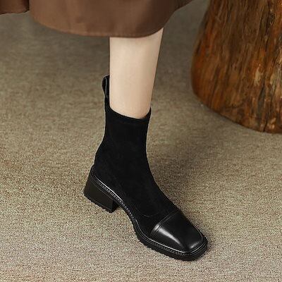 ショートブーツ 韓国ファッション 冬 裏ボアタイプ ウエスタンブーツ シューズ レディース 太ヒール ショット丈ブーツ ーシューズ スエード 黒 スエード調靴