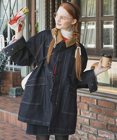 ジャケット カバーオール 2way 襟コーデュロイルーズデニムカバーオール レディース