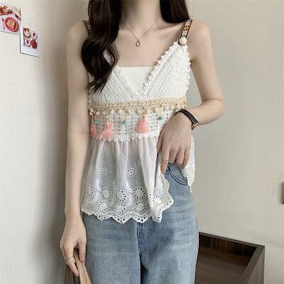 トップス レディース キャミソール 2カラー 韓国 フリーサイズ ホワイト ベージュ カラバリ ニットキャミソール 異素材 ドッキング エスニック風 タッセル パンチングレース ノースリーブ 透け感