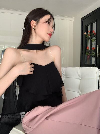 トップス レディース キャミソール ショート S M 韓国 ショート丈 ノースリーブ シフォン フリル かわいい 大人可愛い きれいめ シンプル 上品 エレガント フェミニン シック おしゃれ お洒落 | gizshop