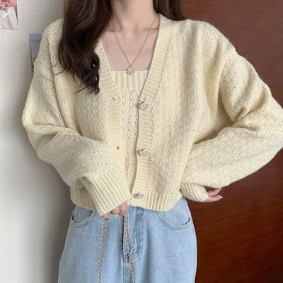 トップス レディース ニット セーター カーディガン キャミソール クロップド クロップド丈 袖あり 長袖 ノースリーブ ノースリ Vネック 襟なし 2点セット ツーピース お得 かわいい 大人 | gizshop
