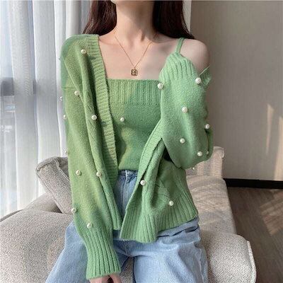 カーディガン キャミソール ツーピース トップス セットアップ レディース ニット ミディアム丈 袖あり 長袖 ドロップショルダー 襟なし デコルテ開き モコモコ 前開き 編み込み ニット 2点セット | gizshop