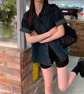 2024春夏トップス デニムシャツ 半袖 ボタン 襟 スタンダードカラー ゆったり 夏 おしゃれ かわいい カジュアル 韓国ファッション レディース お出かけ