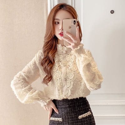 レースシャツ レディース 秋冬新作 ゆったり 立ち襟 長袖トップス レディースファッション 百掛け ブラウス ボトムシャツ