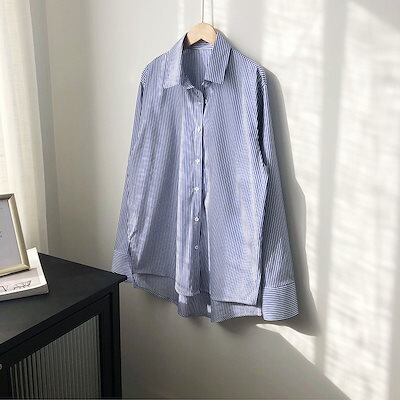 【シャツ レディース】 長袖 長袖シャツ ブラウス 長袖ブラウス トップス 前開き ボタンシャツ ストラップ柄 大きいサイズ 春 夏 秋 角襟 不規則裾 痩せ見せ 通気性 上品 高級感 シンプル エレ | gizshop