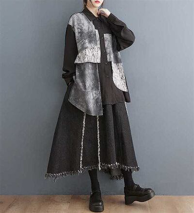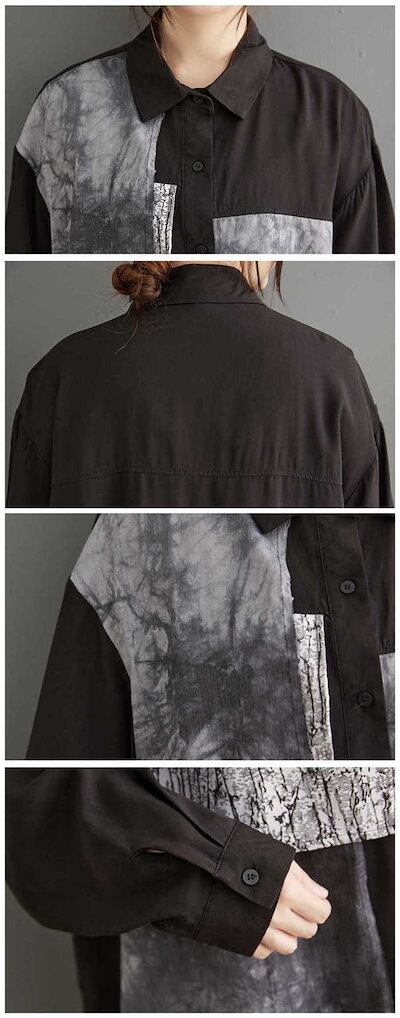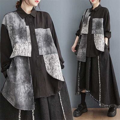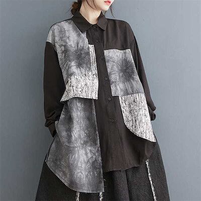 シャツ ブラウス トップス レディース アシンメトリー 上着 長袖 切り替え プリント シャツブラウス デザイン感 ゆったり 着?せ 配色 体型カバー シャツ襟 ボタン 大きいサイズ おしゃれ 大人 | gizshop