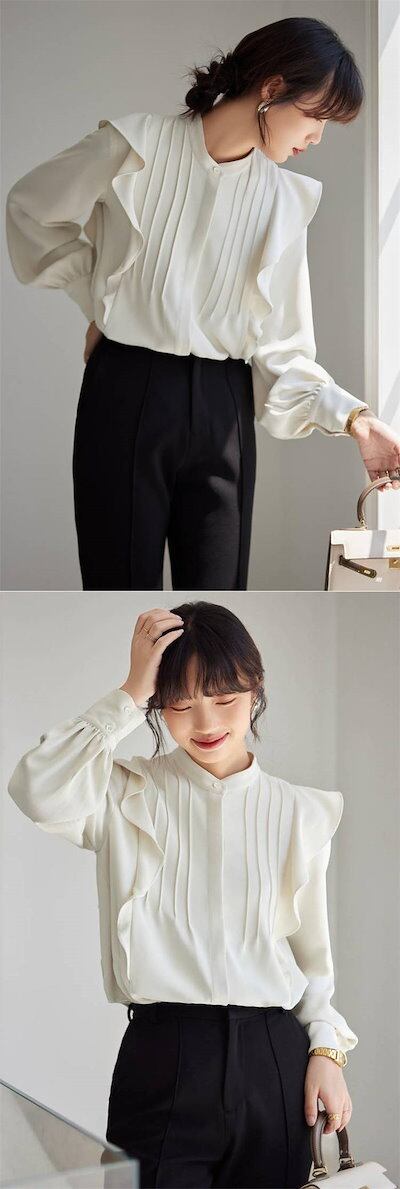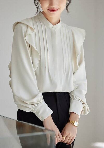 シャツ ブラウス レディース 新作 長袖 立ち襟 フリル 無地 デザイン感 トップス バルーン袖 ベーシック おしゃれ オフィス カジュアル シャツブラウス 前開き 重ね着 上品感 着回し 春 秋 大 | gizshop