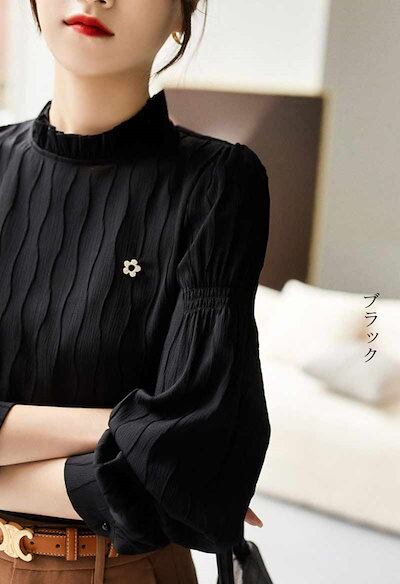 チュニック 長袖 春 ブラウス レディース フリルブラウス シャツ スタンドカラー シャツブラウス トップス タック ギャザー ブラウス フリル 立ち襟 ブラウスシャツ 黒 無地 フリルネック 大きい | gizshop
