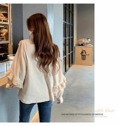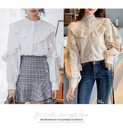 ブラウス 長袖 おしゃれ シャツ レディース 秋 レース フリル 大人可愛い かわいい 襟 立ち襟 スタンドカラー カジュアル ボリューム袖 バルーンスリーブ パフスリーブ