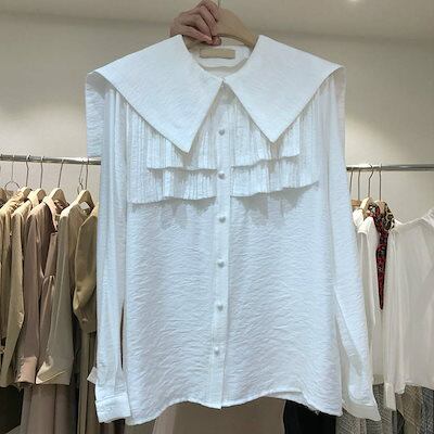 レディース ブラウス フリンジ風 大きな襟 長袖 トップス レトロ カジュアル 可愛い フェミニン 上品 清楚 おしゃれ お出かけ 学生 休日コーデ オフィス デイリー 普段着 ホワイト ベージュ | gizshop