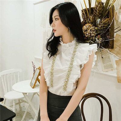レディース ブラウス 立ち襟フリル ノースリーブ ショートシャツ トップス エレガント ゴージャス きれいめ 上品 セレカジ おしゃれ お出かけ オフィス デイリー 普段着 ホワイト 大きいサイ | gizshop