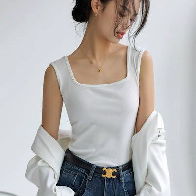 レディース トップス タンクトップ ノースリーブ スクエアネック 襟なし タイト スリム 細身 きれいめ シンプル カジュアル 上品 おしゃれ かっこいい こなれ感 クール モード系 主役級 存在感 | gizshop