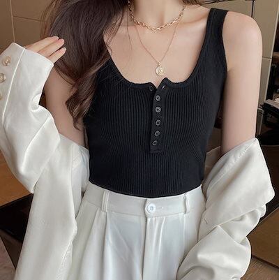 トップス インナー レディース タンクトップ 袖なし ノースリーブ ヘンリーネック フェミニン ストリート リブ きれいめ シンプル カジュアル おしゃれ かっこいい レトロ ラフ スポーティー | gizshop